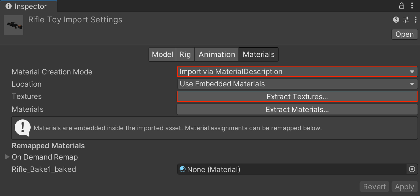Make sure that the 'Material Creation Mode' is 'Import via MaterialDescription', If you have embedded textures into the FBX file, please click the 'Extract Textures...' button to extract all embedded textures; Otherwise, please click the 'Extract Materials...' button to extract the material.